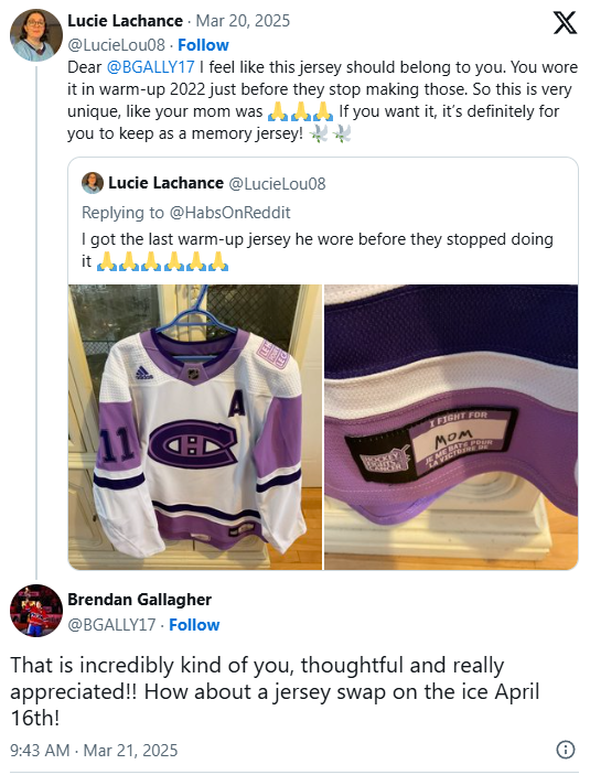 À propos de Gallagher et de la Xosphère, avez-vous vu cet échange dans laquelle une fan propose de lui redonner le chandail qu’il a porté lors d’une période d’échauffement pour « vaincre le cancer ». Au dos, Gally y avait écrit « mom ». Il l’invite sur la patinoire à l’occasion du dernier match du CH le 16 avril pour lui échanger le chandail. Wow!