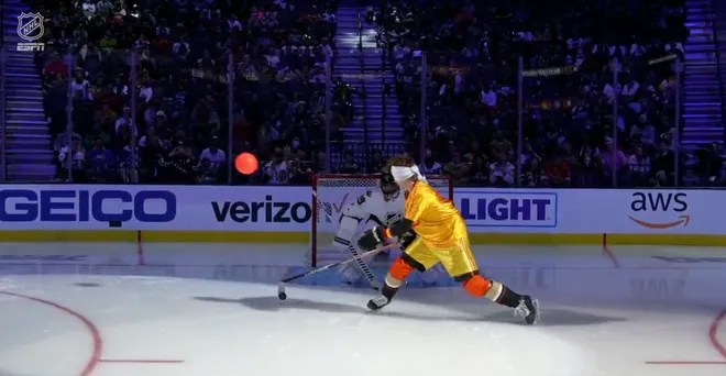 Photo: Zegras qui se donne en spectacle au match des étoiles. Il marque un but les yeux bandés. Son déguisement rend hommage à l’un de mes films préférés: Dodgeball