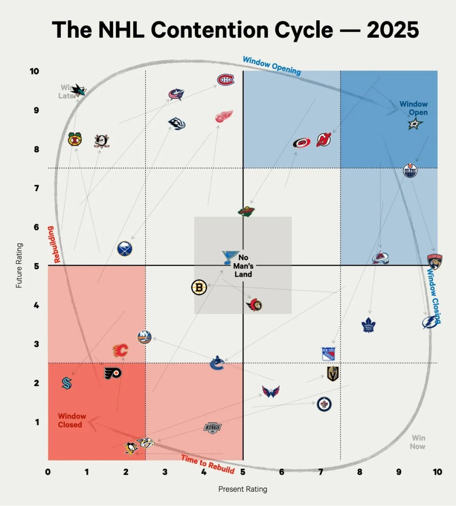 Dans le même ordre d’idées, il y a cet article de Luszczyszyn et Wheeler (Athletic) qui illustre la valse des équipes: celles qui montent pour devenir des aspirantes et celles qui descendent et voient leur fenêtre se refermer.
