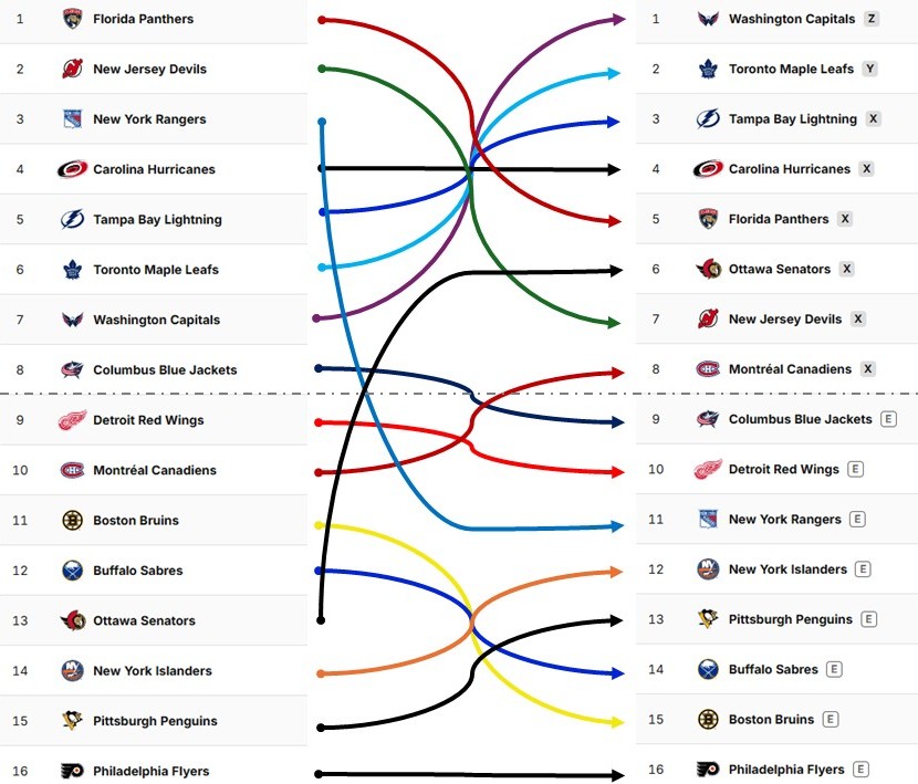 J’ai comparé le classement de l’an dernier après 10 matchs à celui à la fin de l’année. De manière surprenante, il n’y a pas eu beaucoup de changement. Comme vous pouvez le voir ci-dessous pour la Conférence de l’Est, sur les 8 équipes qui auraient accédé aux séries après 10 matchs, seulement 2 ont dégringolé hors des séries, soit les Rangers et les Blue Jackets.