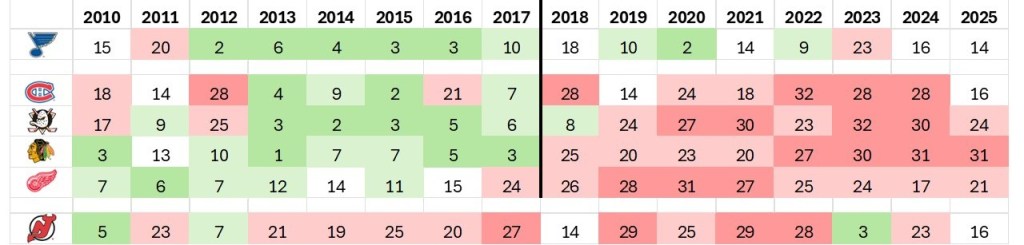 Et pour faciliter la lecture, j’ai mis en rouge les années où les équipes ont été exclues des séries (avec un gradient pour en dénoter la sévérité), et en vert celles où elles ont terminé au sommet.