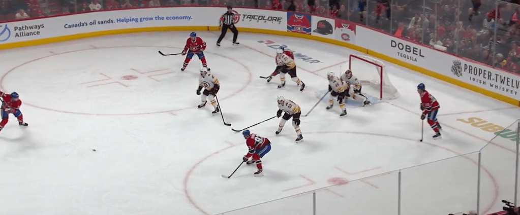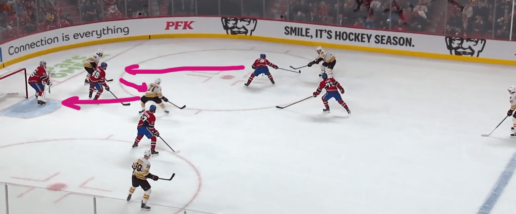 Les Bruins ont compté un but identique samedi. Un quick set low et l’on voit clairement le 1-3-1 des Bruins avec les lignes de passe qui sont non-couvertes par les joueurs des Canadiens.