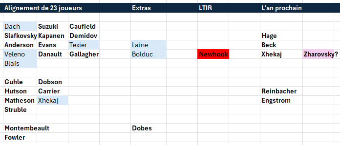 Déjà, c’est difficile de compléter un alignement de 23 joueurs cette année si tout le monde revient en santé. L’alignement ci-dessus compte 23 joueurs avec Newhook. Pendant qu’il se trouve sur la LTIR, on peut ajouter qu’un seul extra entre Laine, Bolduc et Dobes. Les autres devront « disparaître » (i.e. être envoyés à Laval ou échangés). Bien sûr, Blais peut être sacrifié lui aussi si vous lui préférez un autre joueur mais n’oubliez pas que son siège est dans les gradins.